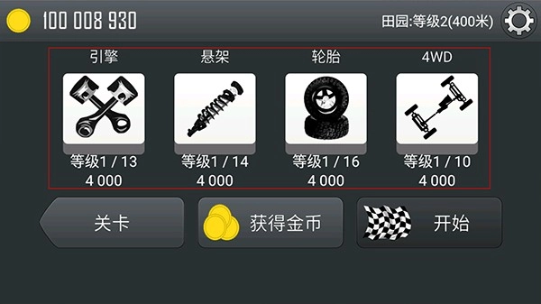 7、另外我们在游戏中获得的金币可以用来购买新的车辆、解锁新的地图,还能对汽车的引擎、悬架、轮胎、4WD系统进行升级,以此提升汽车的速度等性能。