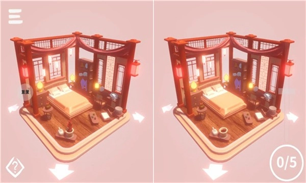 在这款游戏里,玩家得对比两边的房间场景,借助放大、缩小、移动视角以及点击周围箭头的办法,切换观察位置来找出不一样的物品。等所有差异都被找出来,就能成功通过这一关卡了。