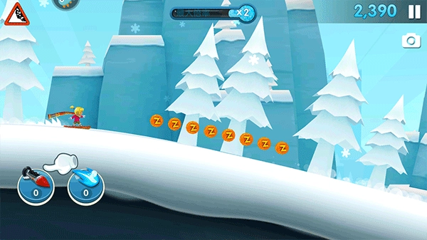 9、全部选中完成后就可以进入游戏啦,在游戏中玩家使用我们前面学习的技巧来操控角色跳跃、后空翻、滑翔,同时左下角还有道具可以使用,道具可以帮助玩家滑得更远