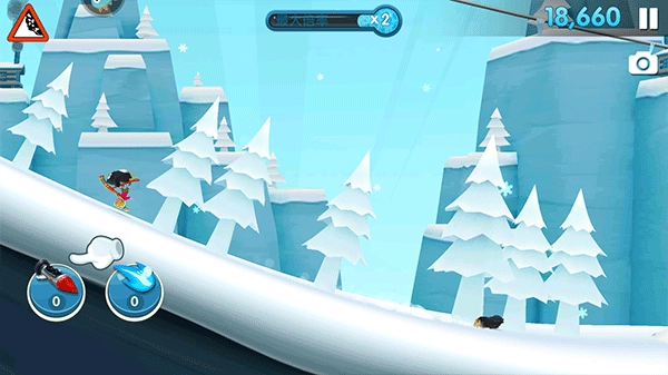 在《滑雪大冒险2》中,不仅可以挑战夺命竞速,还可以滑动屏幕作出特技动作!根据单、双板和坐骑的不同,特技动作也会发生改变!向前、向后、向上、向下赶紧试试吧!!!