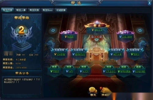 1、创建帮派或申请加入某个帮派成功后,帮派界面会变成上图所示。在此界面可以查看当前所属帮派的各种信息,包括:帮名、等级、人数、资金