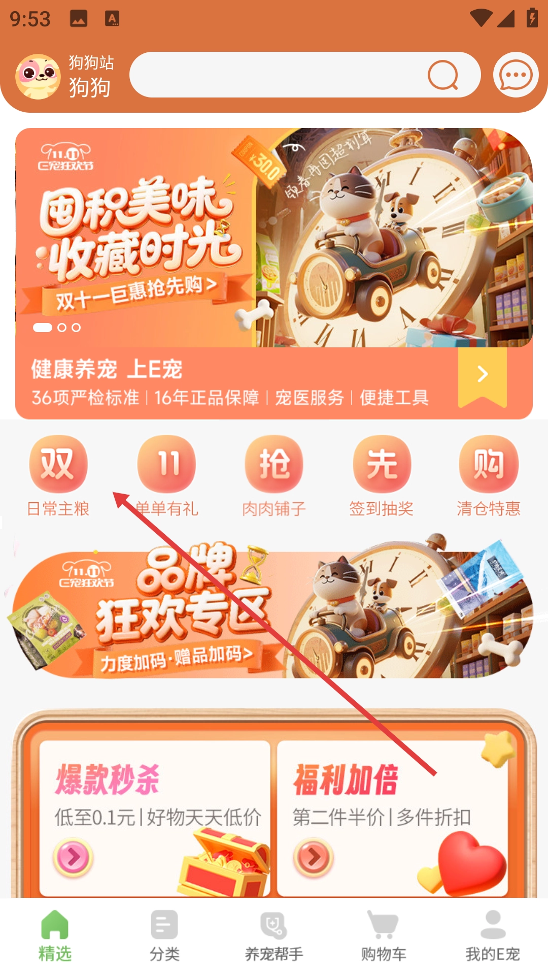 1、打开E宠精选页面后,点击【日常主粮】选项,即可进入狗狗常用主粮的页面。