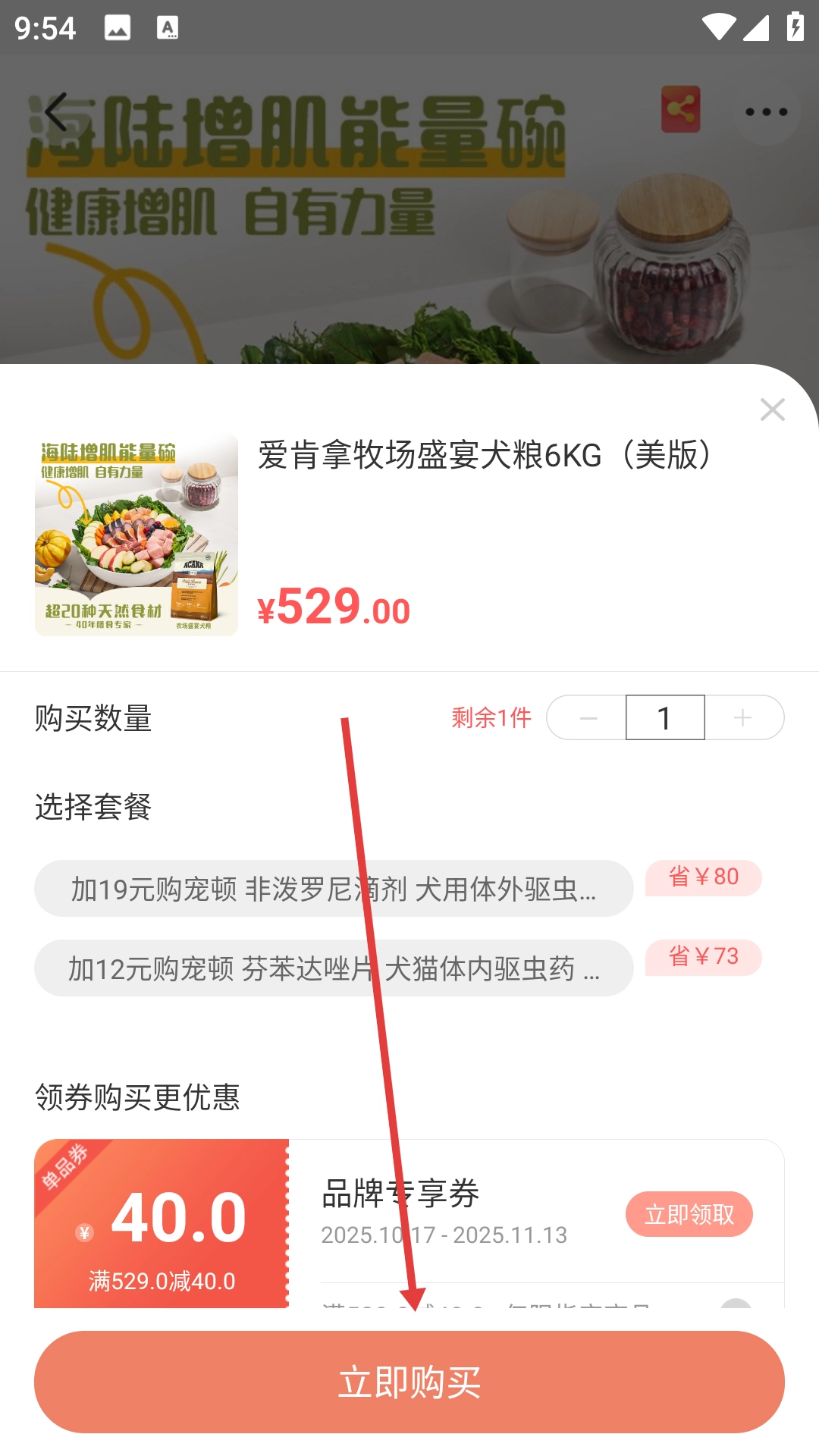 4、在购买信息确认页面确认购买数量、套餐及优惠券后,点击【立即购买】,完成商品购买。