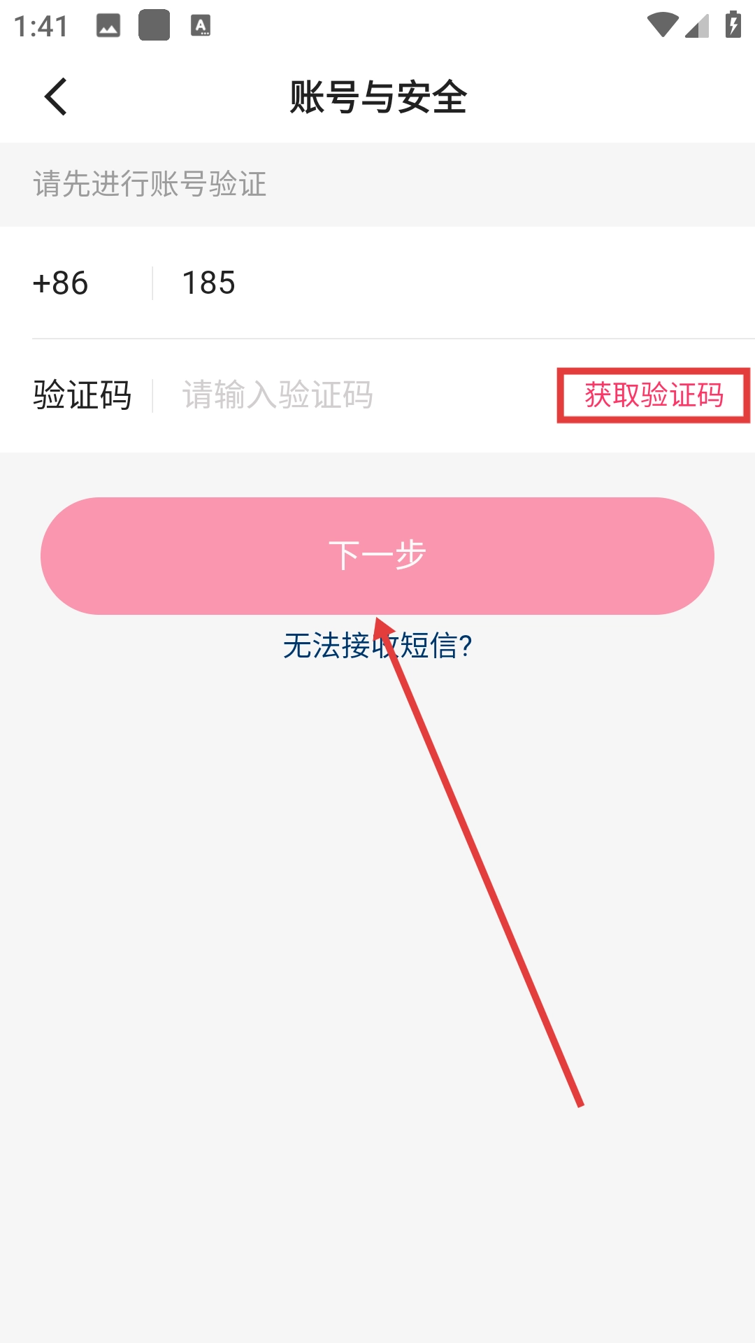 4、在账号验证页面点击【获取验证码】,输入验证码后点击【下一步】,完成账号注销的验证操作。