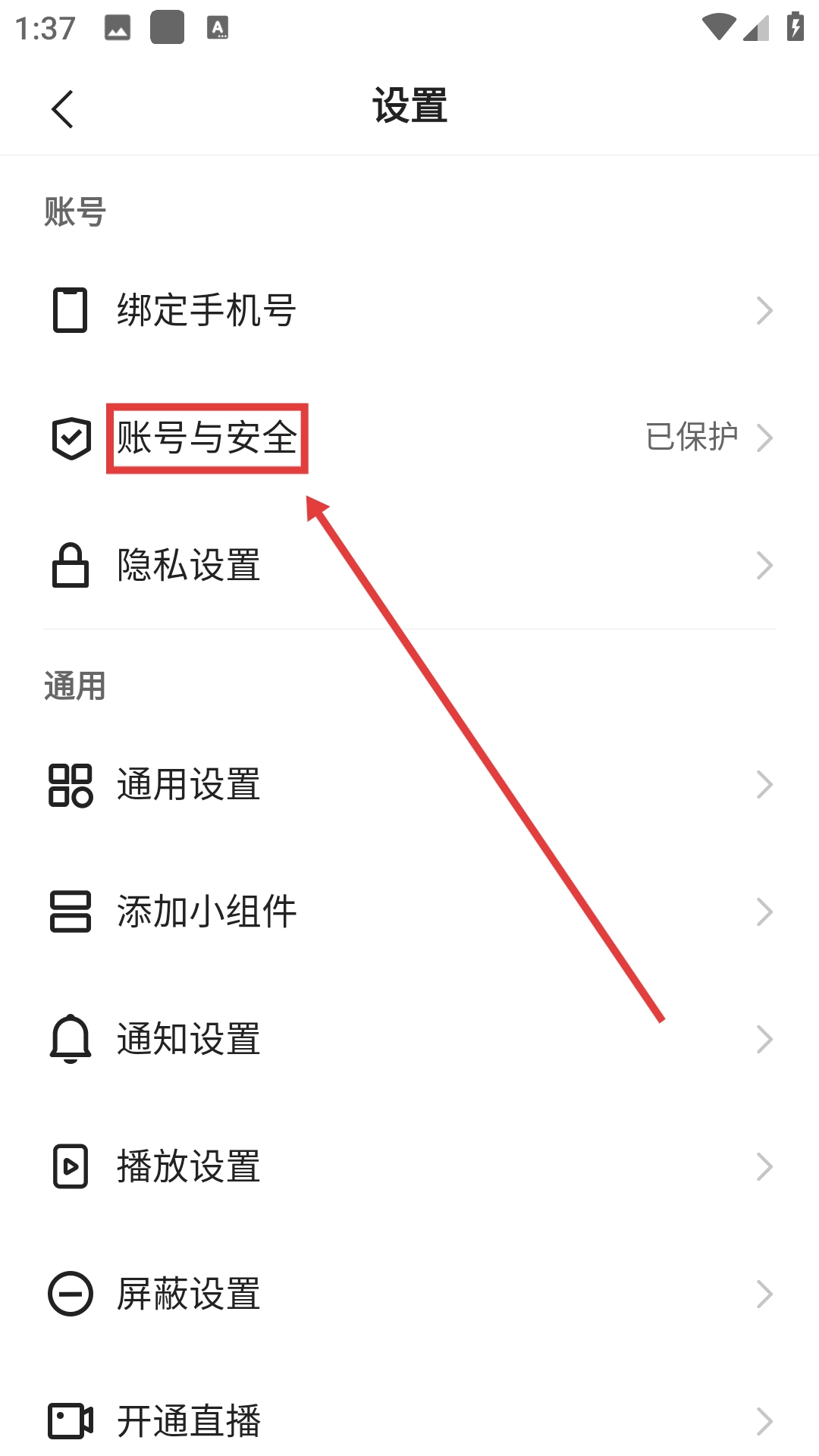1、进入设置页面后,点击【账号与安全】选项,即可进入账号安全设置页面。