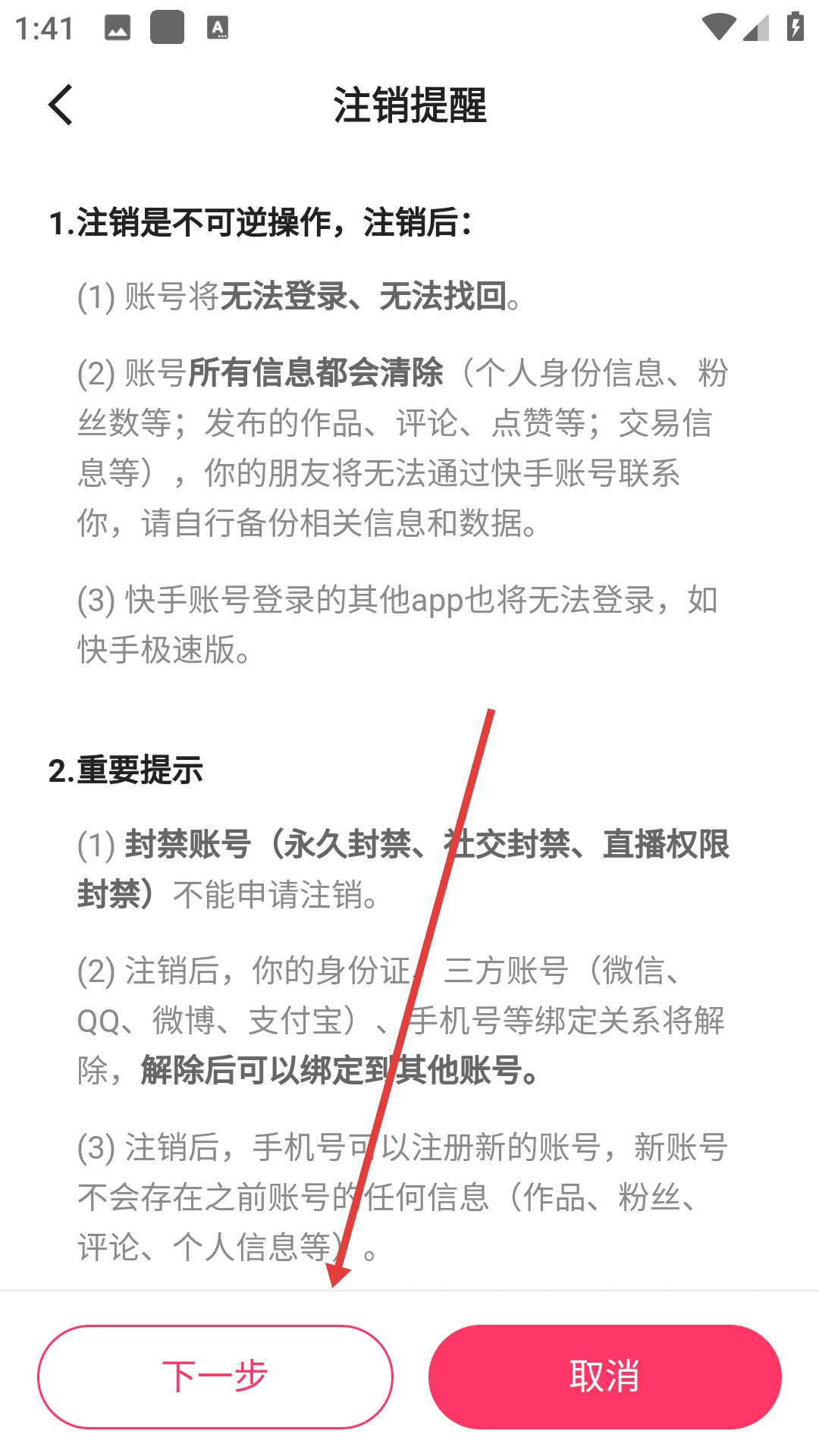 3、在注销提醒页面确认提示后,点击【下一步】,进入账号验证页面。