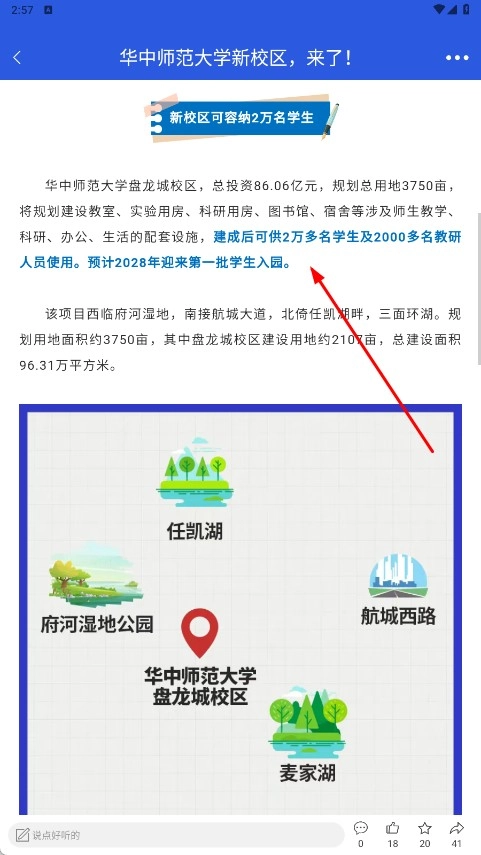 2、进入新闻详情页,可浏览【华中师范大学盘龙城校区-新校区介绍】及位置图示。