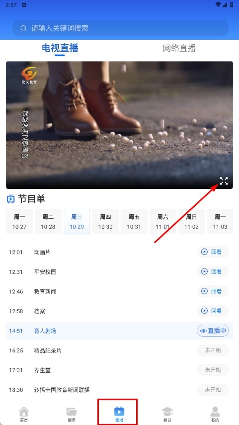 3、点击底部【直播-功能按钮】,进入电视直播页面,可查看节目单及直播内容。
