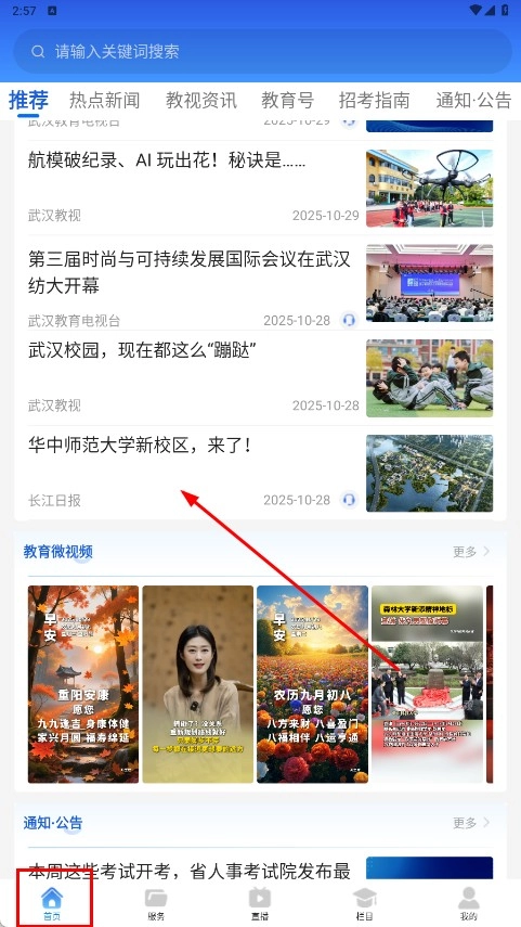 1、在首页的推荐板块里,若点击《华中师范大学新校区来了》这一新闻标题,即可查看该新闻的详细内容。
