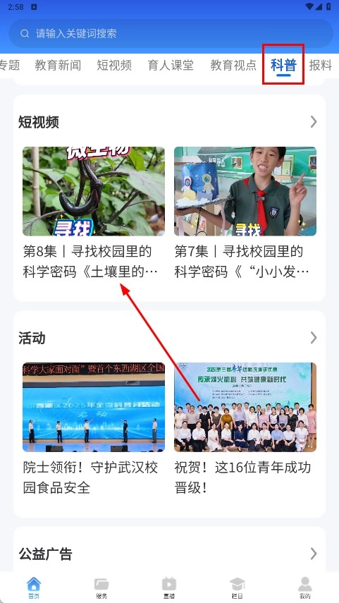 4、点击顶部【科普-分类标签】,进入科普板块,可浏览【寻找校园里的科学密码-短视频】等内容。