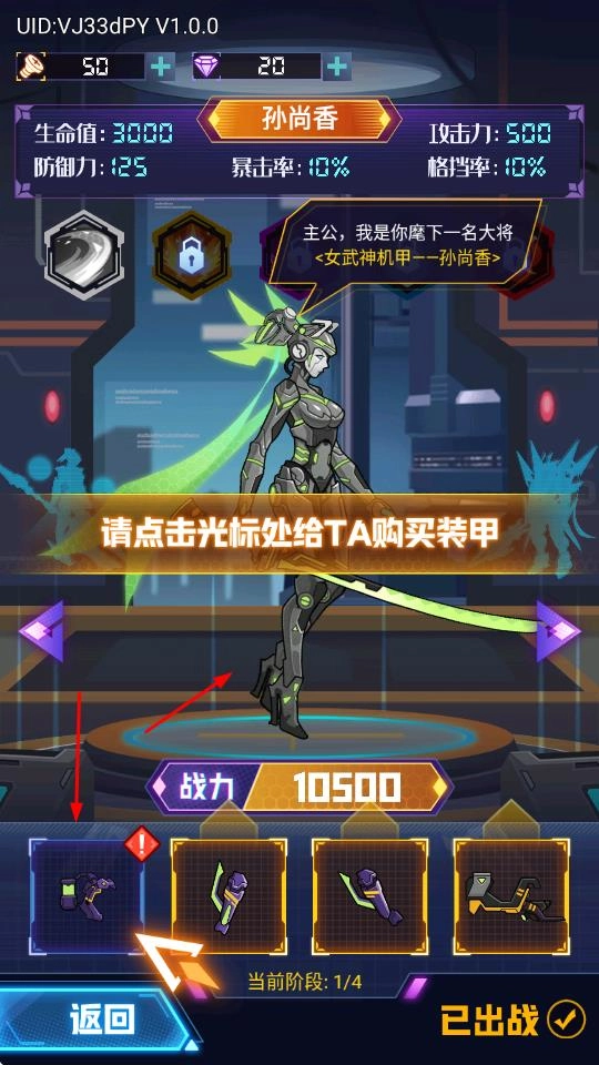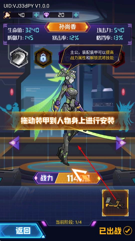 2、拖动装甲到孙尚香身上进行安装,装配后可提高战力属性并解锁武将技能,优化机甲战斗配置。