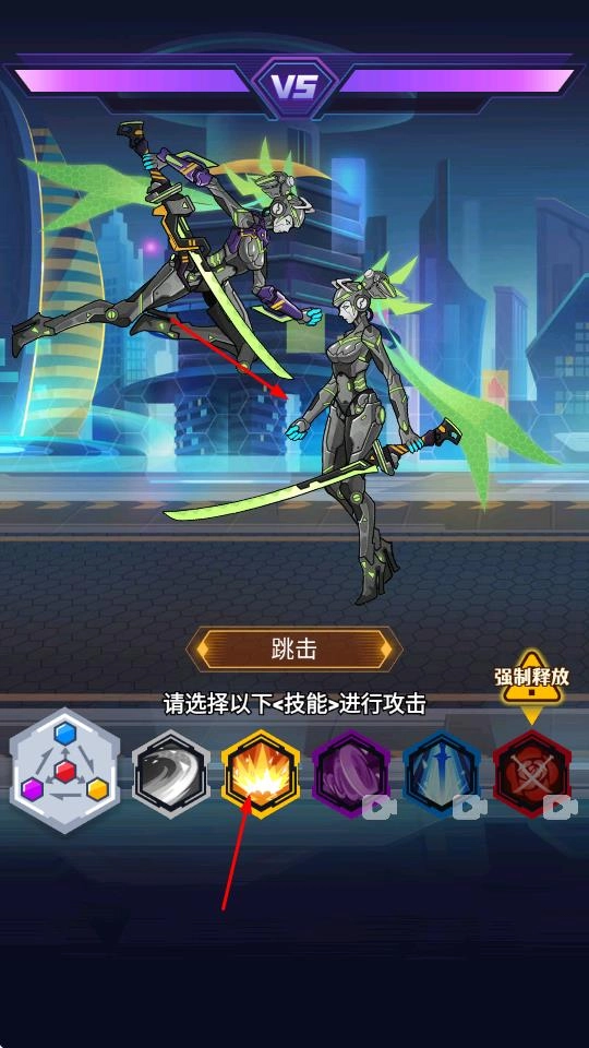 3、在对战界面,选择跳击等技能进行攻击,与敌方机甲展开战斗,发挥机甲战力,推进对战进程。