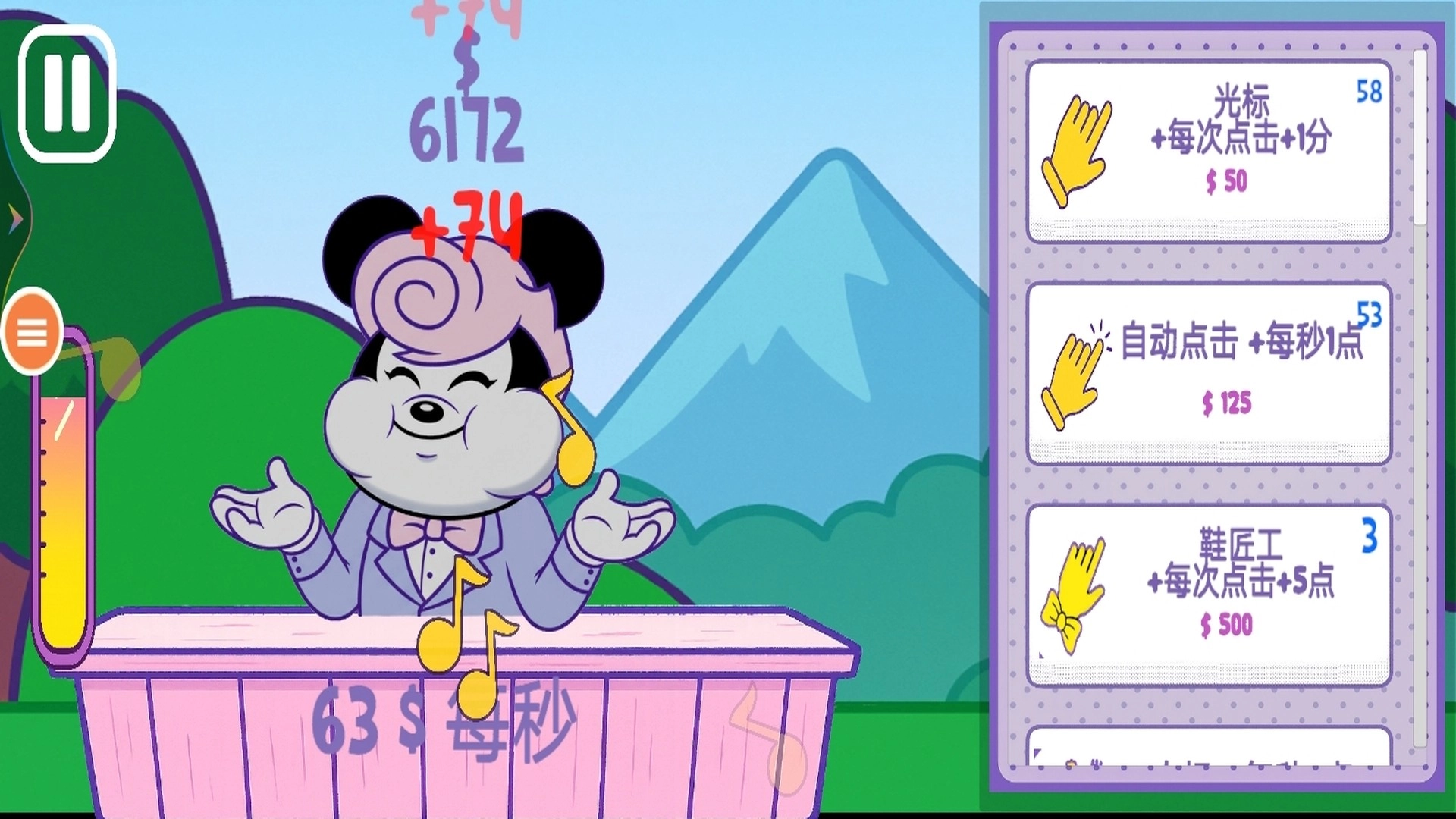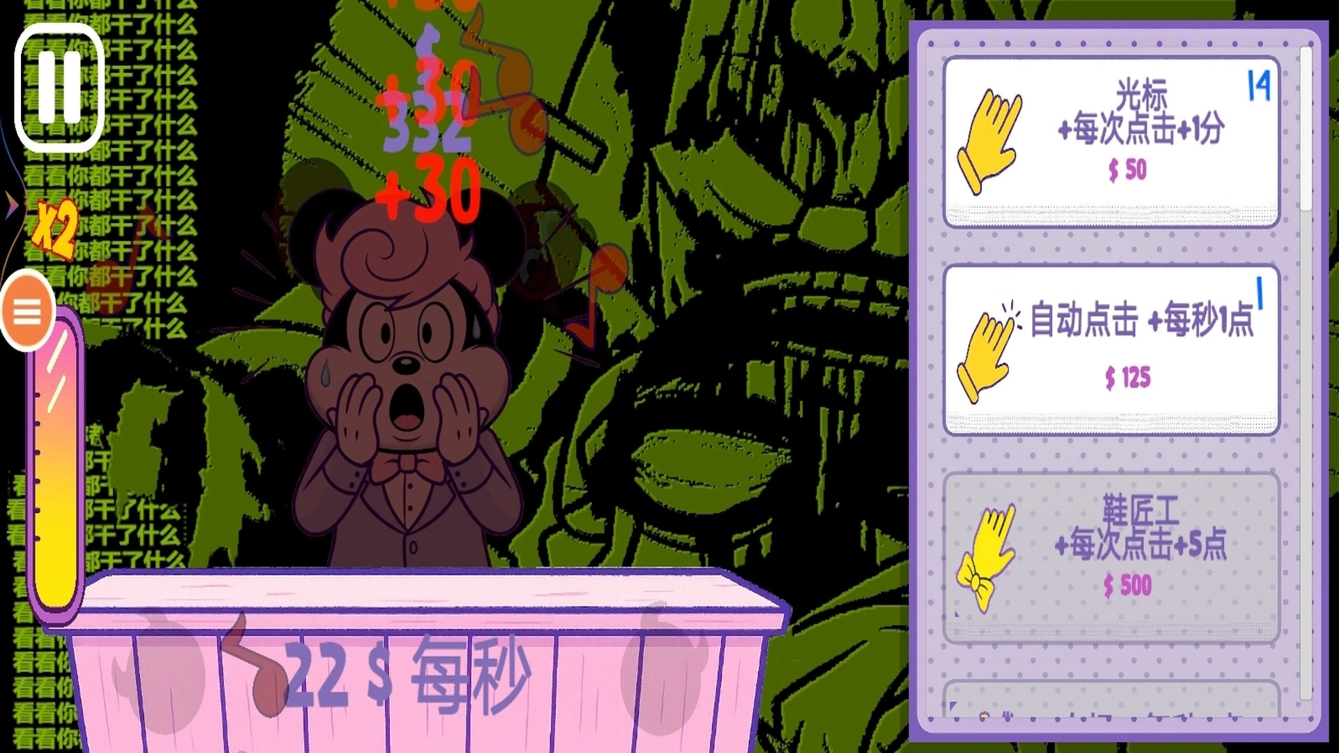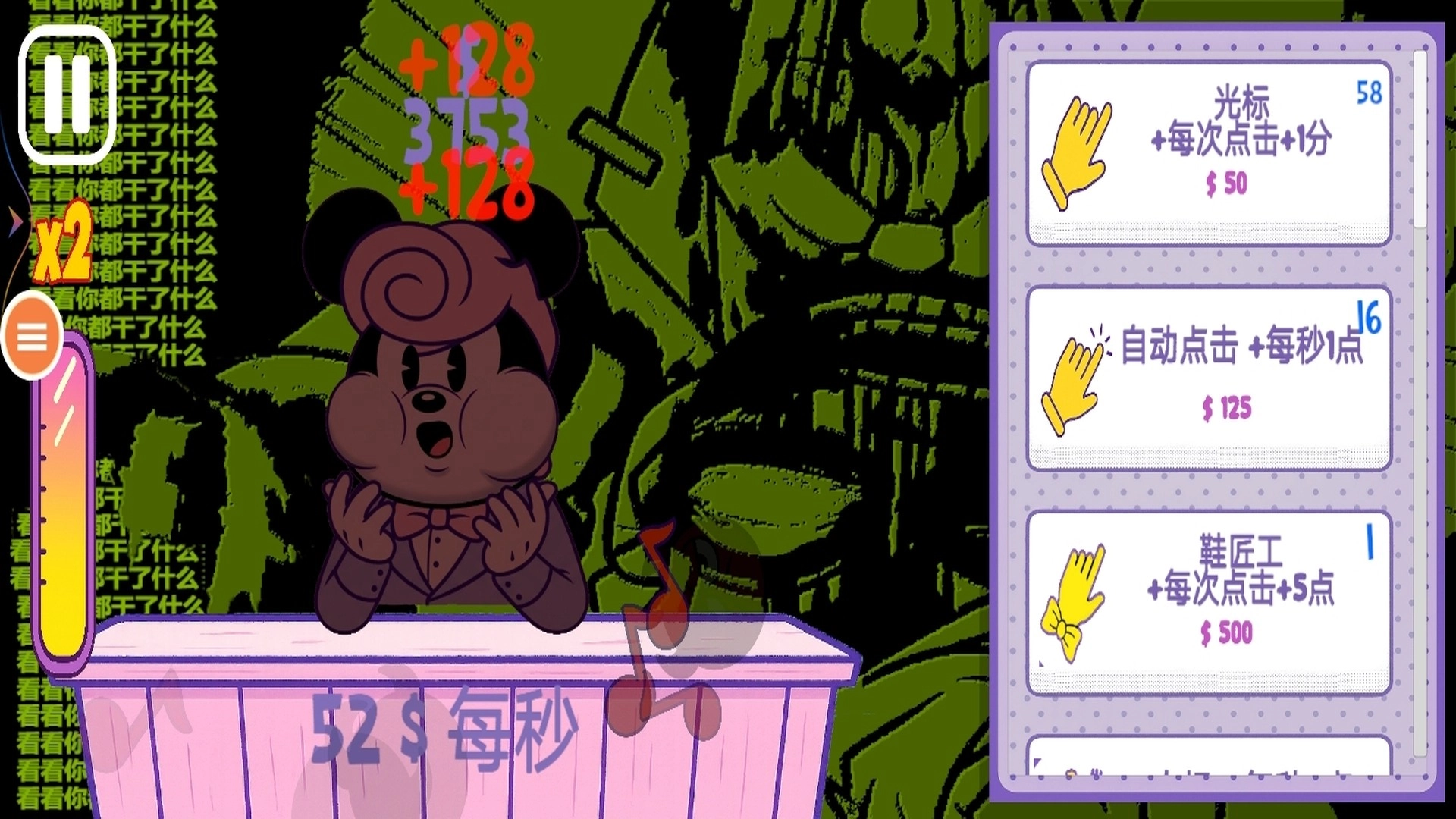 1、通过点击 交互元素获取金币,每次点击对应固定收益,可通过升级提升单次点击的金币数量,是前期主要赚钱方式。