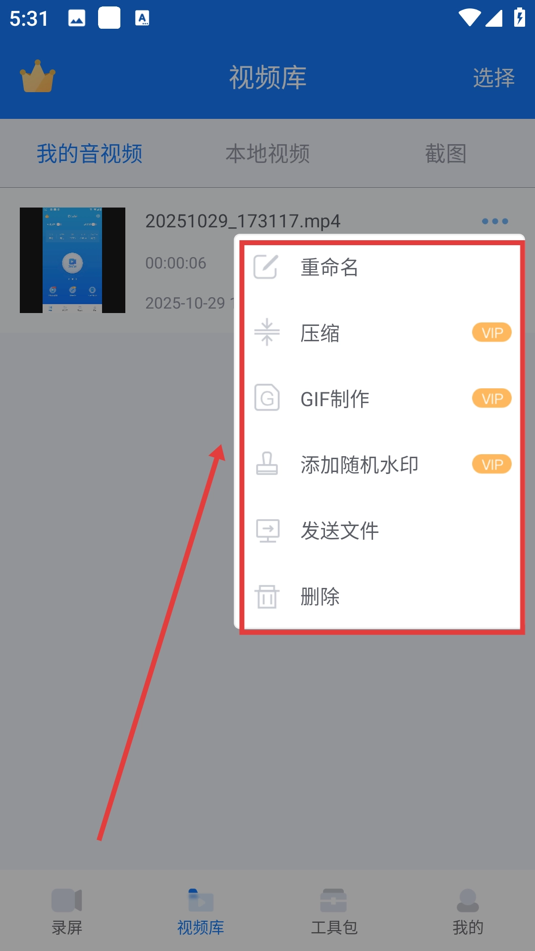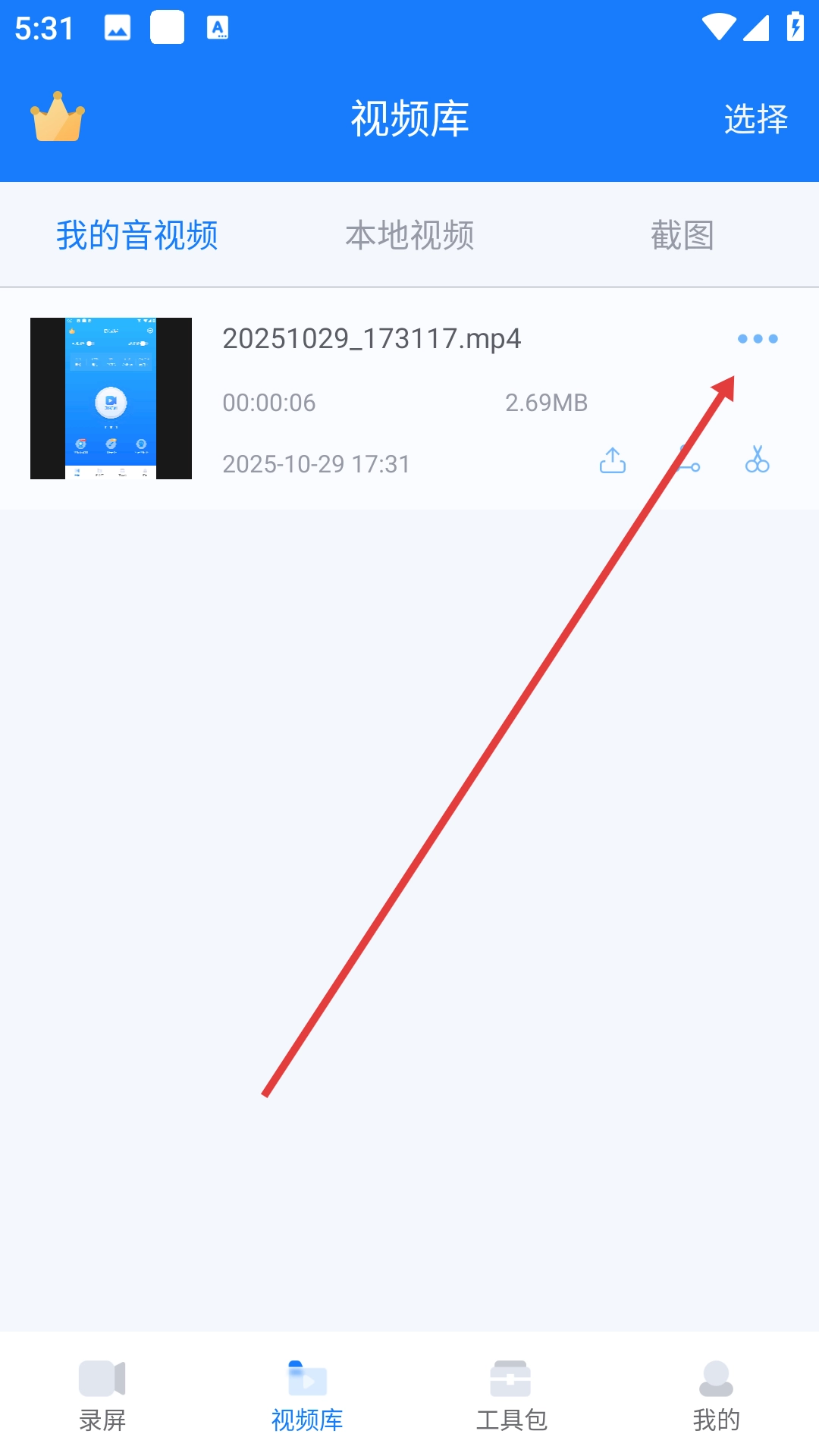 3、点击底部【视频库】,进入视频库页面后,点击目标视频右侧的三点菜单按钮。