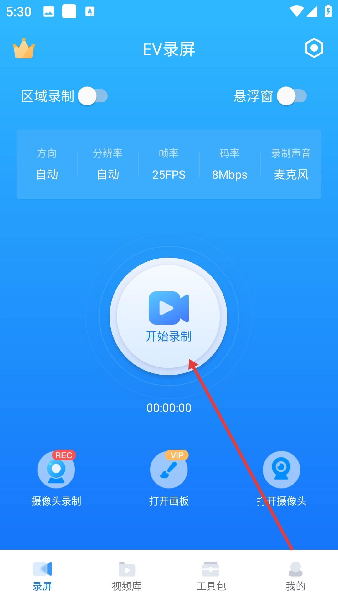 1、在EV录屏的主界面找到【开始录制】按钮并点击,即可启动屏幕录制功能。