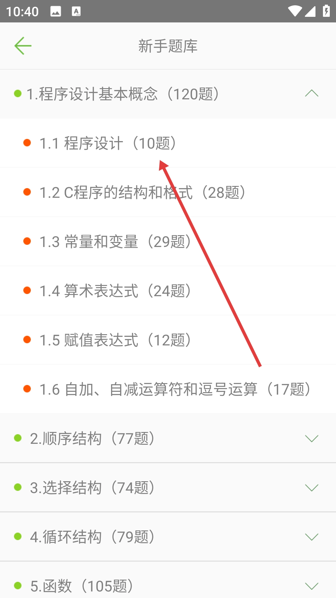 3、在新手题库页面选择【1.1程序设计(10题)】,进入题目练习页面。