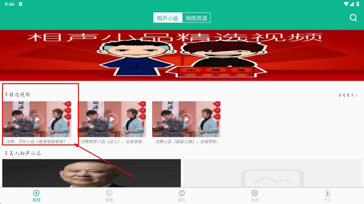 在精选视频区域,点击【沈腾与艾伦合作的小品《爸爸爸爸爸爸》对应的视频封面】,即可进入该视频的播放页面。