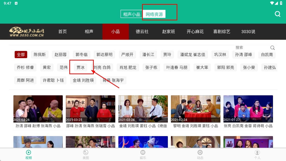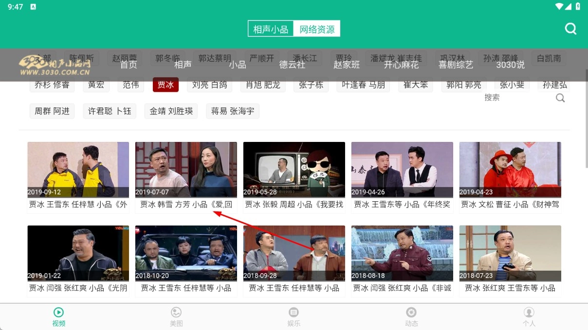 4、在贾冰标签下,点击对应的小品视频封面,即可观看贾冰的小品内容。