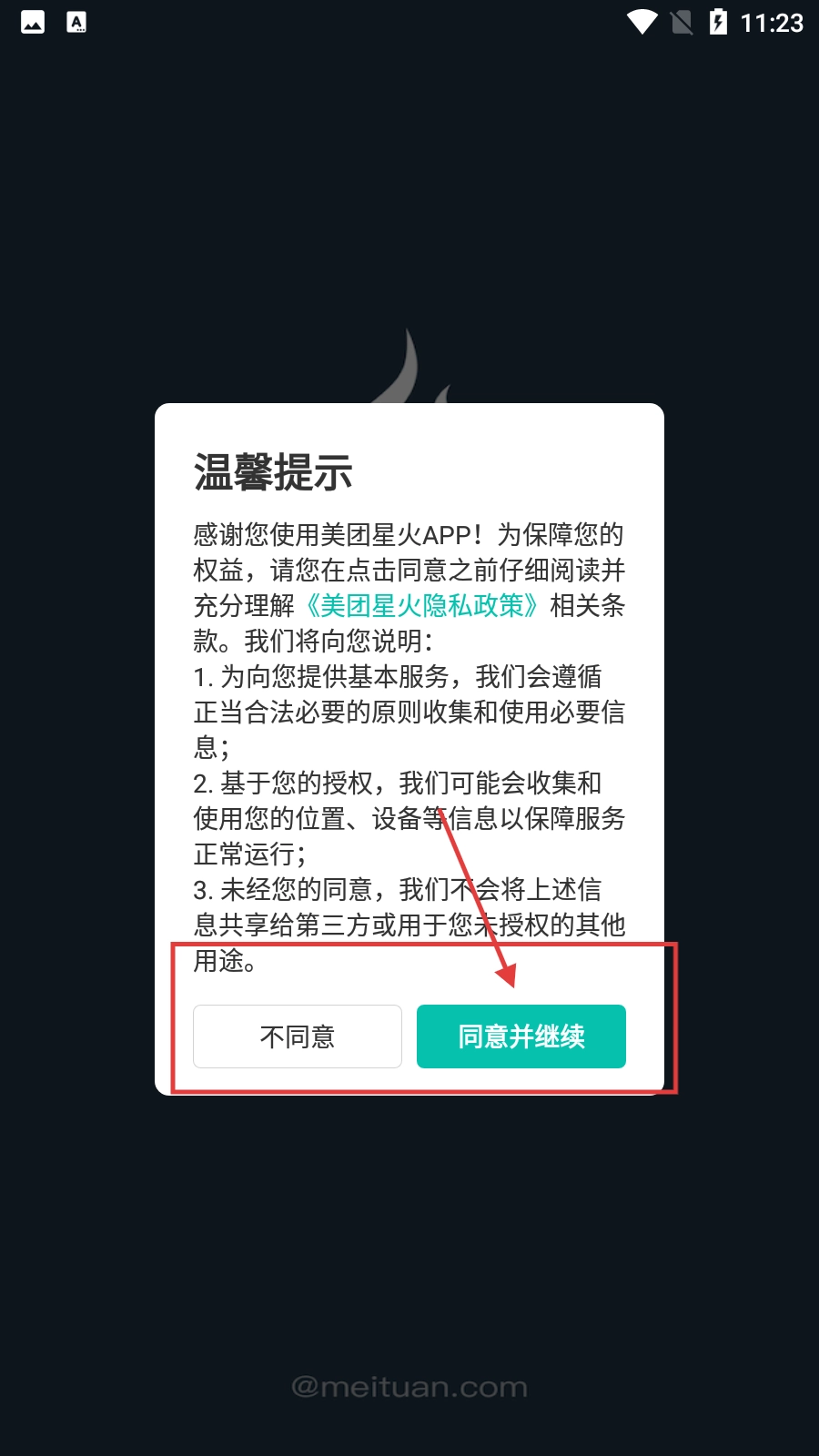 在温馨提示界面,点击【同意并继续】按钮,以确认《美团星火隐私政策》。