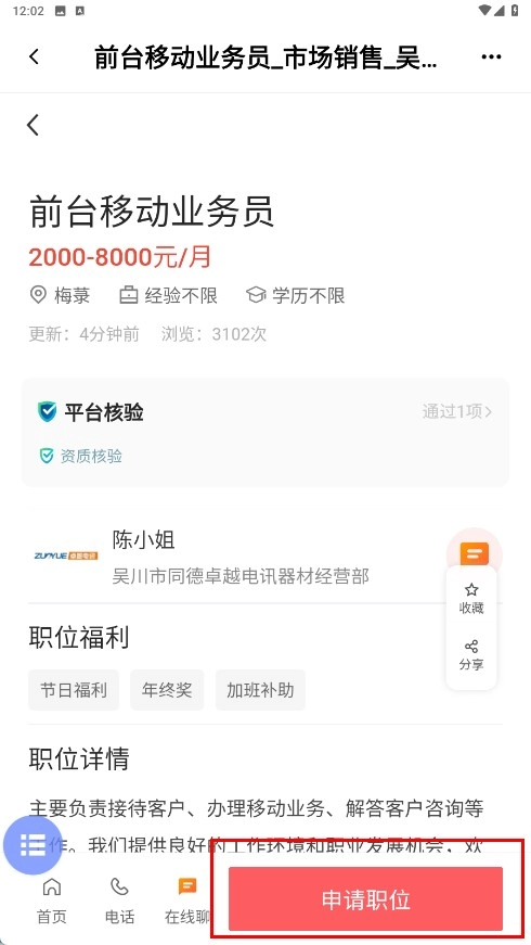 4、进入职位详情页后,点击【申请职位-功能按钮】,进行职位申请操作。