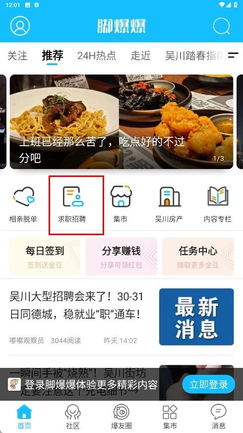 1、点击【求职招聘】功能按钮,即可进入吴川招聘网页面。