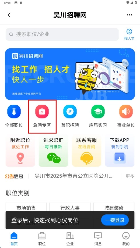 2、在招聘网页面,点击【急聘专区-功能选项】,进入急聘职位列表页。