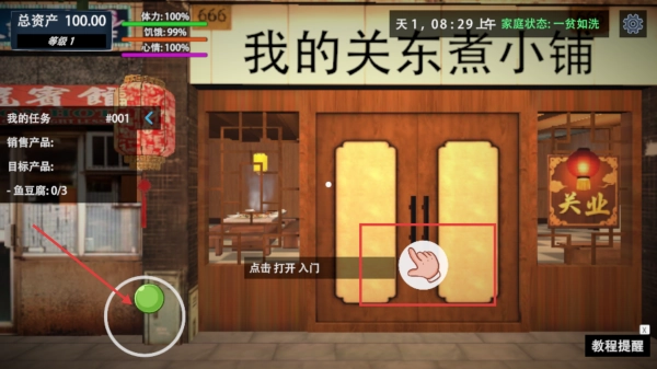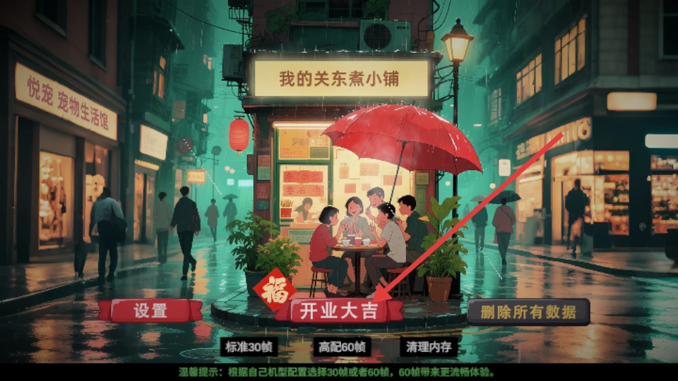 1、点击“开业大吉”进入我的关东煮小铺,开启关东煮店铺的经营旅程,准备迎接接下来的顾客与经营挑战。