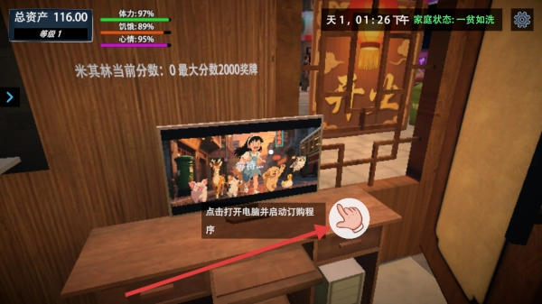 3、进入店铺后,走到电脑旁点击“点击打开电脑并启动订购程序”,进入采购界面,为后续经营做准备。