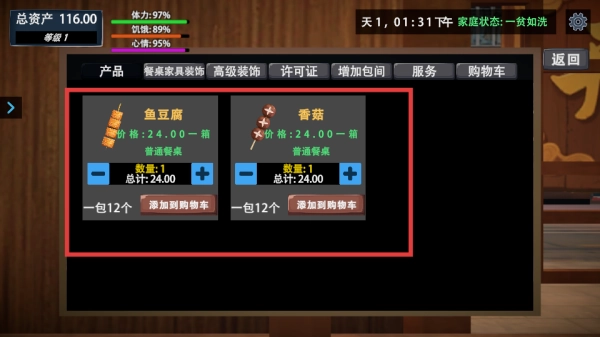 4、在采购界面,有鱼豆腐、香菇等产品,价格均为24.00一箱,可调整数量后添加到购物车,采购食材用于店铺经营。