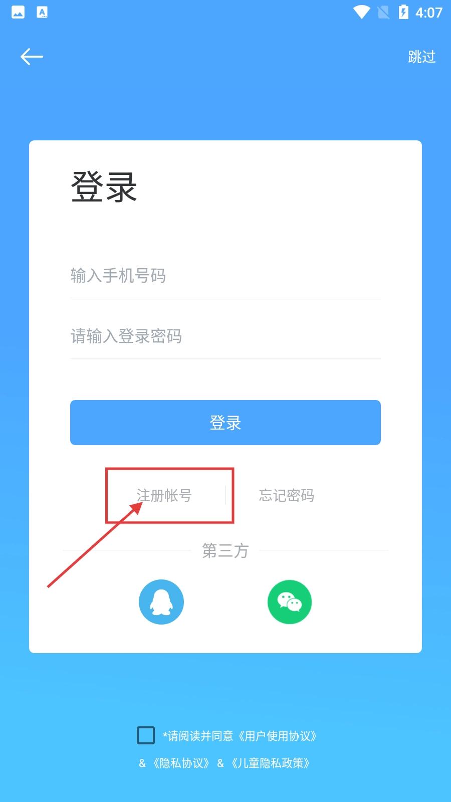 3、在登录页面,点击【注册帐号】选项,进入注册界面。