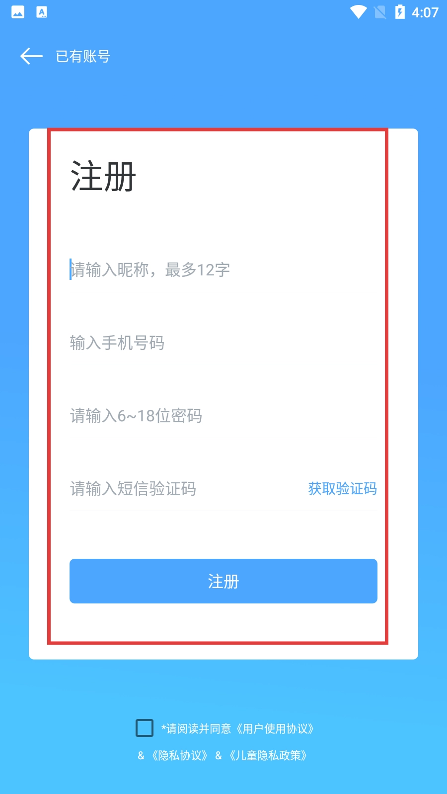 4、在注册界面,依次输入昵称、手机号码、密码和短信验证码,勾选同意相关协议后,点击【注册】按钮,完成注册流程。
