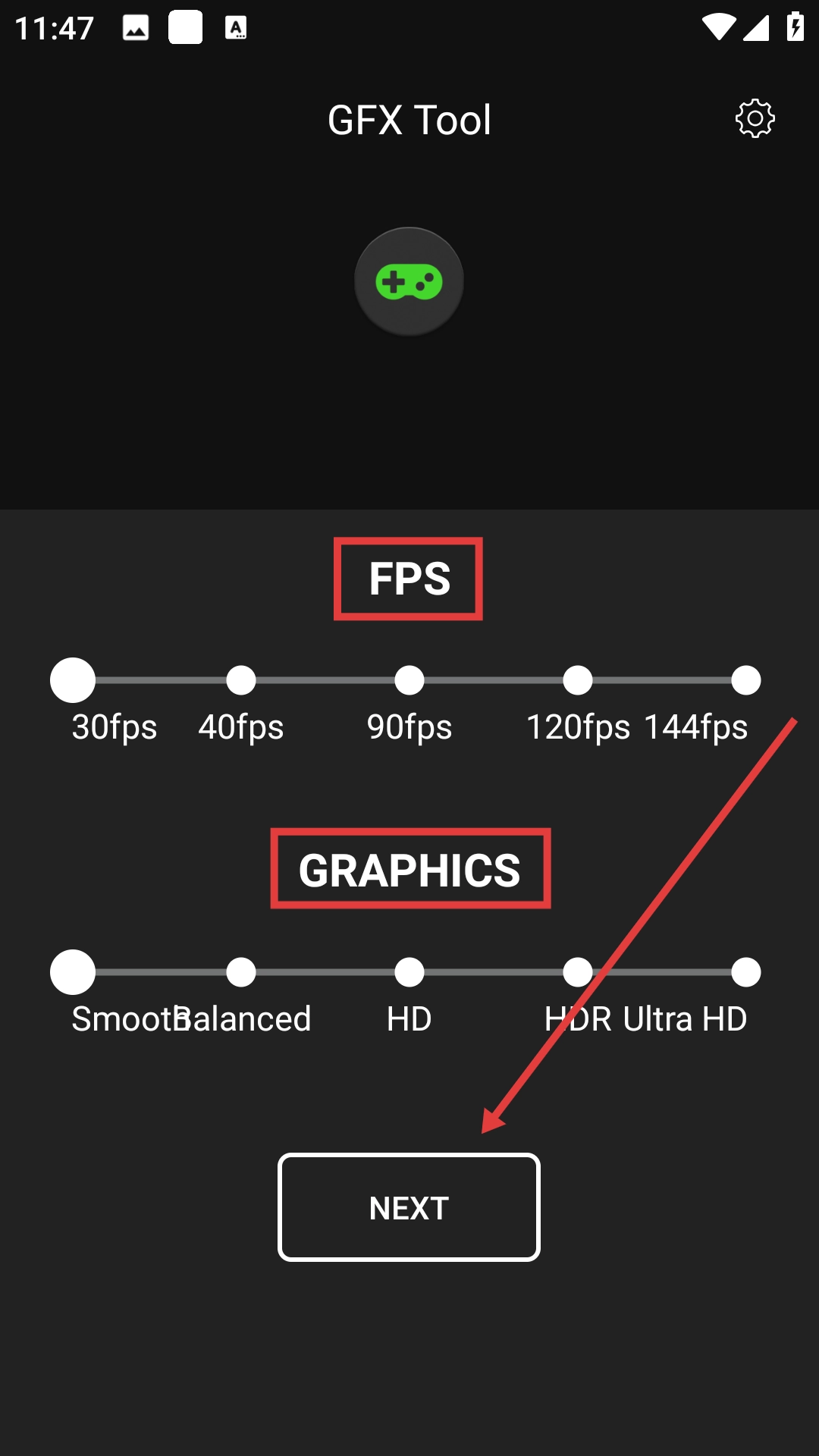 3、在FPS和图形质量设置页面完成调整后,点击【NEXT】。