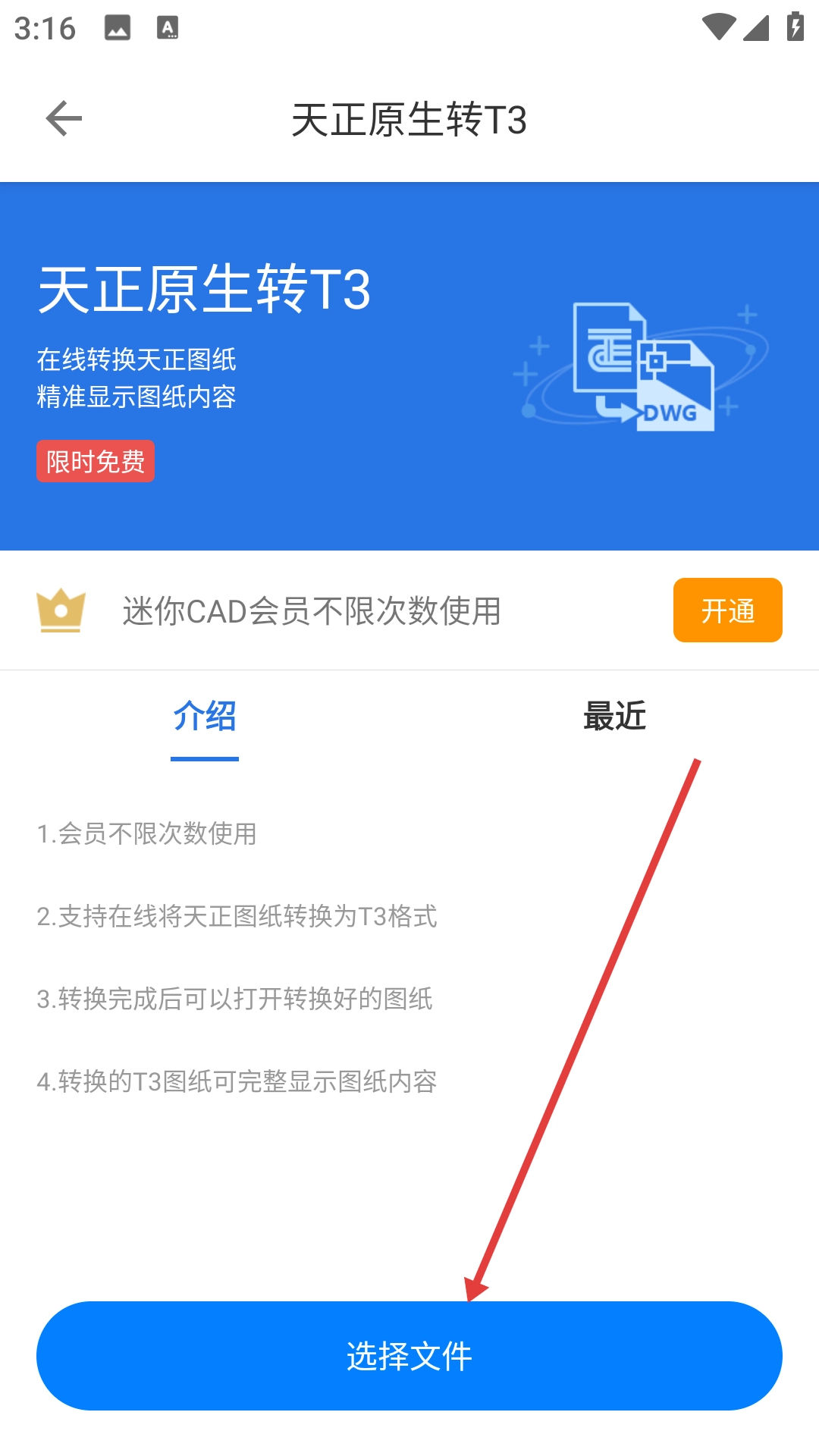 3、在天正原生转T3页面点击【选择文件】,进入文件选择页面。