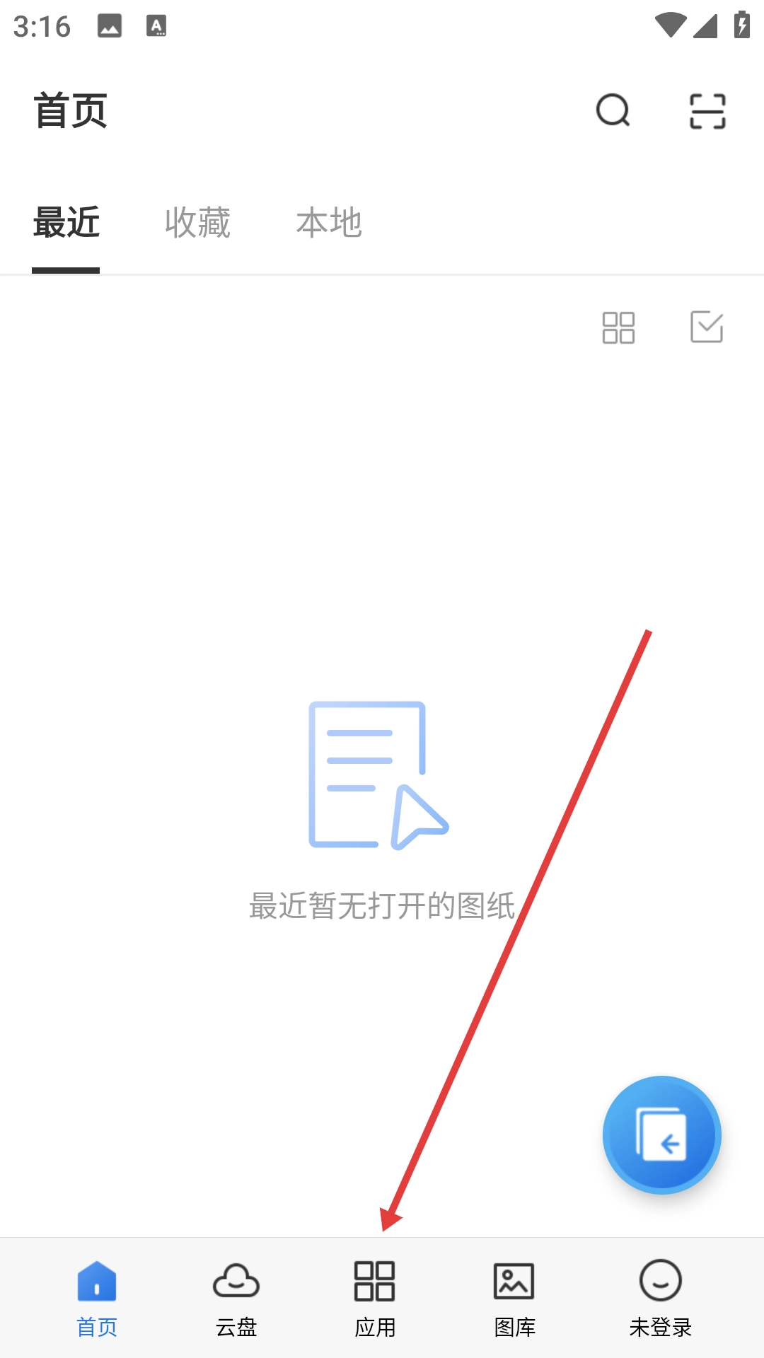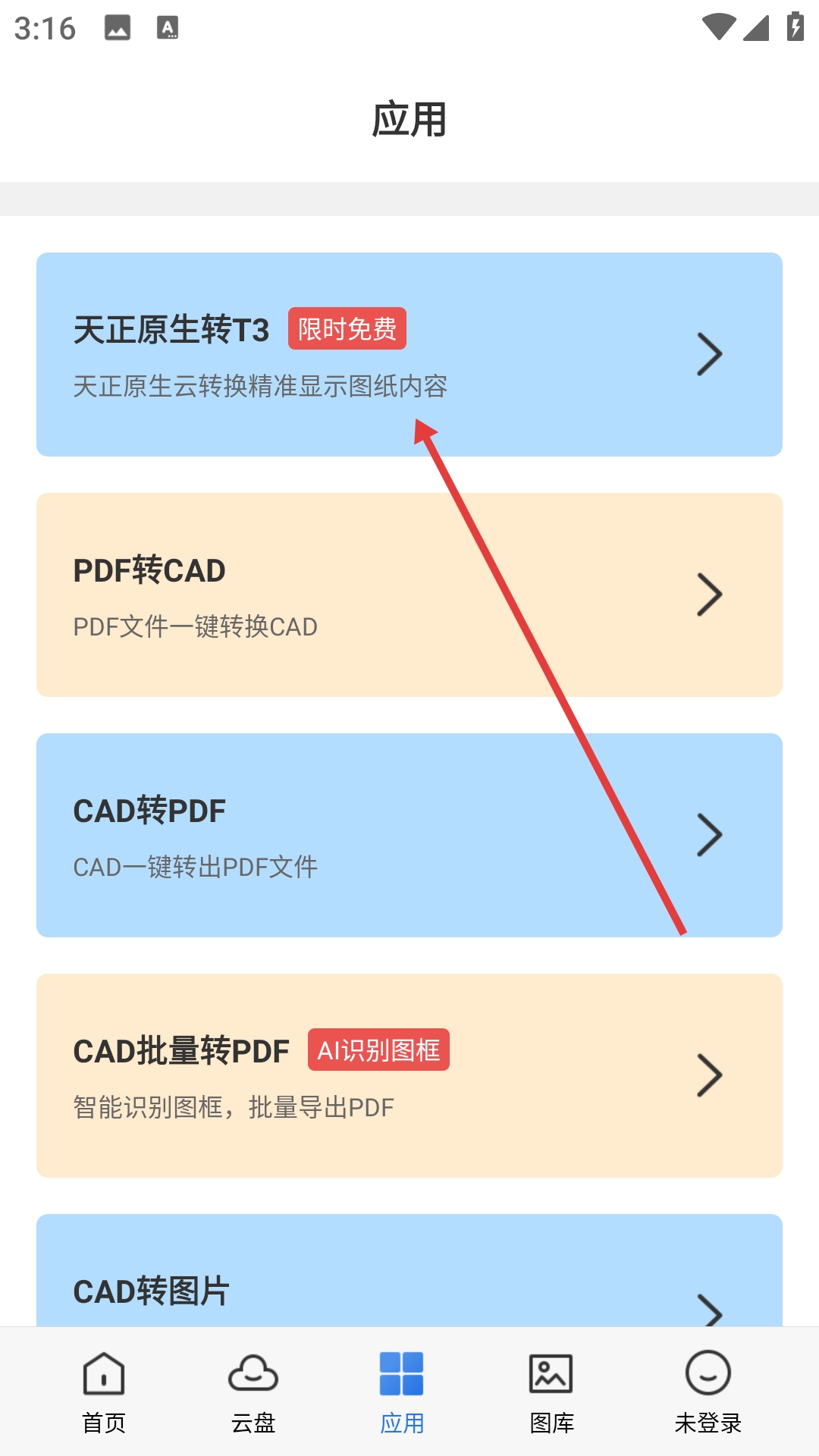 1、点击底部的【应用】选项,进入应用功能页面后,就能看到各类图纸转换工具。