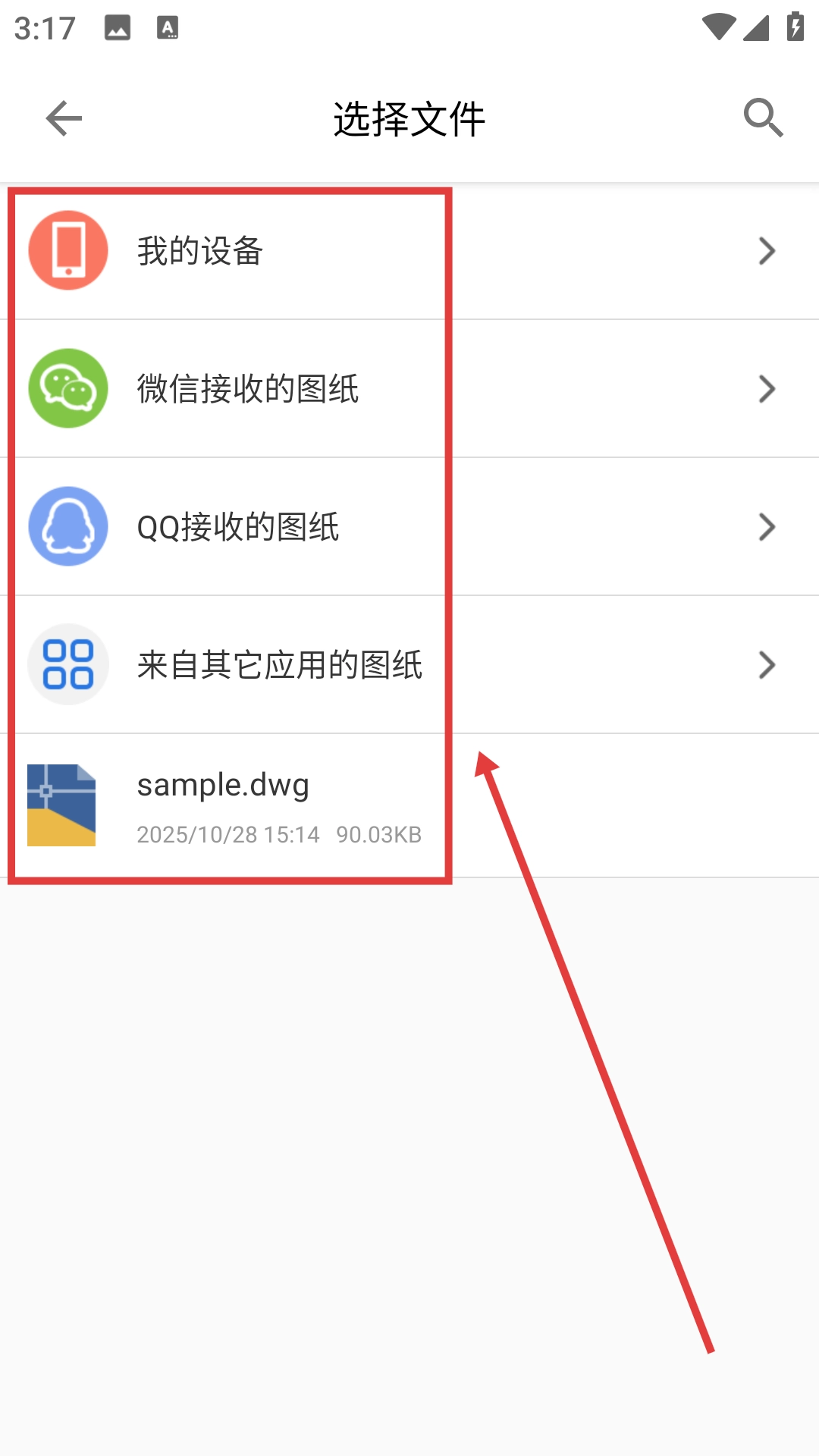 4、在文件选择页面,可选择【我的设备】【微信接收的图纸】等来源或【sample.dwg】文件进行转换。