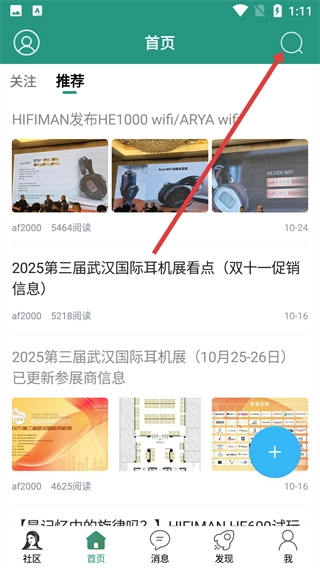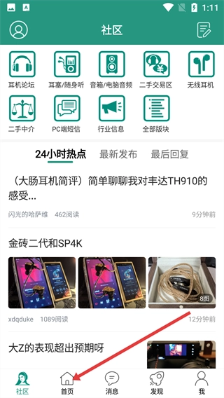 1、在社区界面,点击底部的【首页】按钮,进入首页后,就能浏览到推荐的耳机相关资讯。