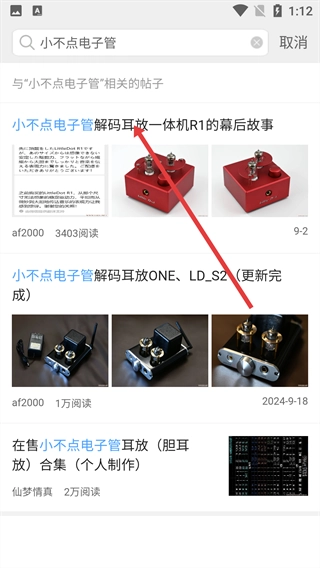 3、在搜索页面输入【小不点电子管】,点击相关帖子(如小不点电子管解码耳放一体机R1的幕后故事),进入帖子列表。