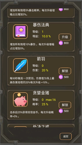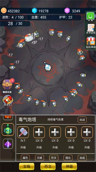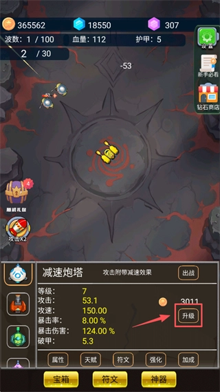 1、进入关卡后炮塔会自动发起攻击,击败敌人会获得金币,金币可以用来升级炮塔等级,提升攻击等属性;