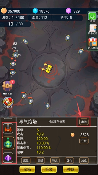 2、左边提供带有不同属性的炮塔,选中并点击右边出战即可(需要先将之前出战的炮塔下场才能出战哦);