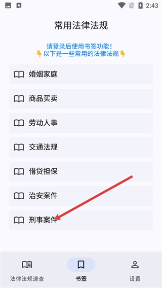 2、在书签页面,点击【刑事案件】分类,进入刑事案件相关法律法规列表页面。