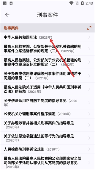 3、在列表中,点击【中华人民共和国刑法(2023年)】,进入该法律的详情页面。