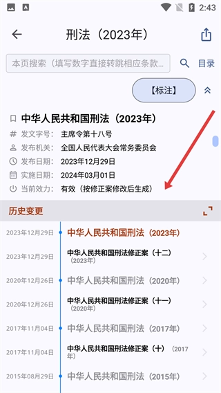 4、在详情页面,可查看刑法的发布机关、实施日期、当前效力等信息,同时能浏览其历史变更记录。