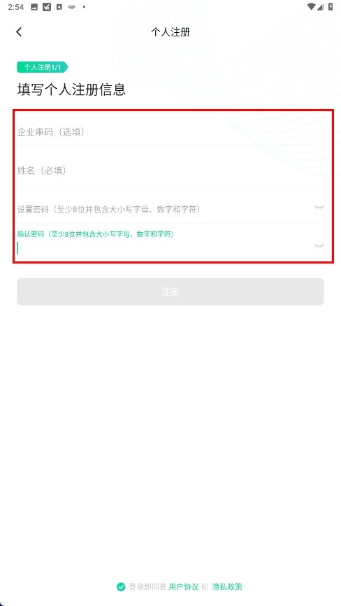 4、选择个人注册后,填写【企业代码(选填)】【姓名(必填)】和密码,点击注册完成个人注册。