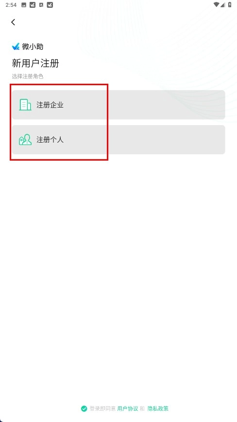 2、新用户注册时,可选择【注册企业】或【注册个人】角色。