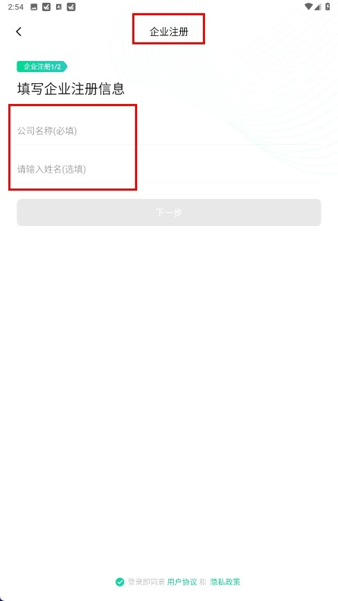3、选择企业注册后,填写【公司名称(必填)】和【姓名(选填)】,点击下一步继续注册。