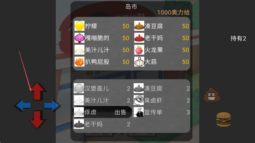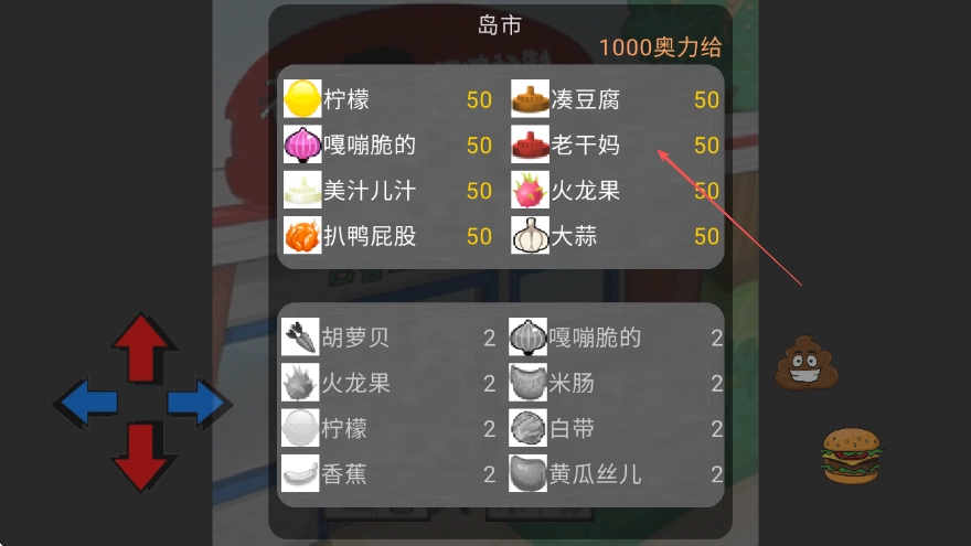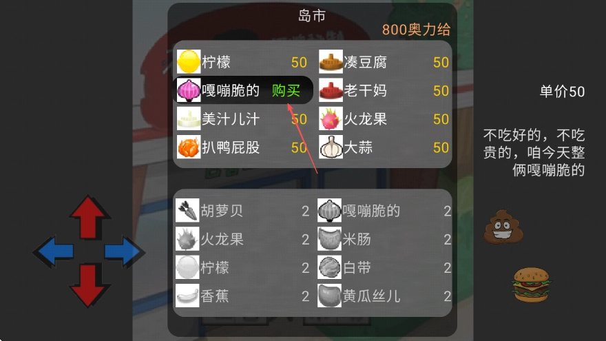 1、进入游戏后,可借助屏幕左侧的方向键切换视角,查看各类食材及其对应的价格,例如老干妈定价为50奥力给。