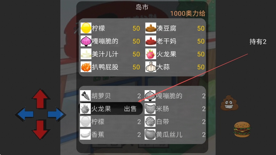 2、找到想要出售的食材,比如火龙果,点击进行出售操作获取奥力给货币。