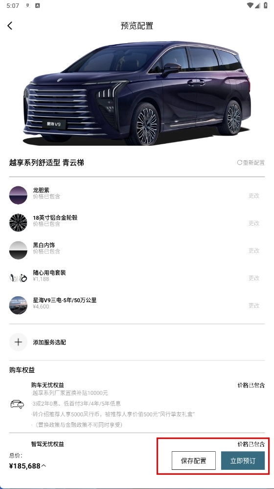 4、在预览配置页面,可查看车辆配置详情,点击【保存配置】或【立即预订-功能按钮】完成操作。