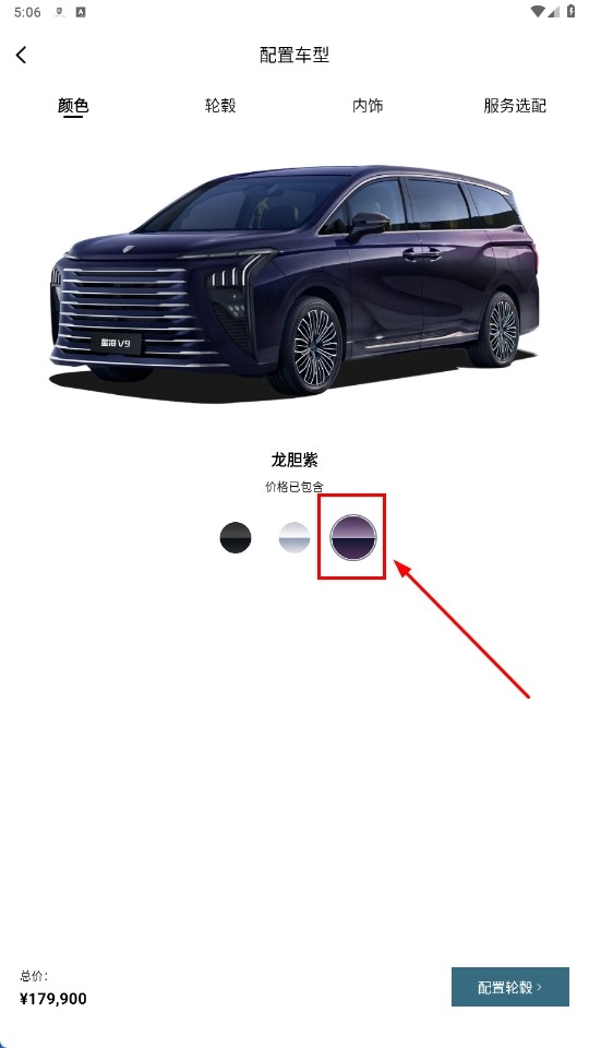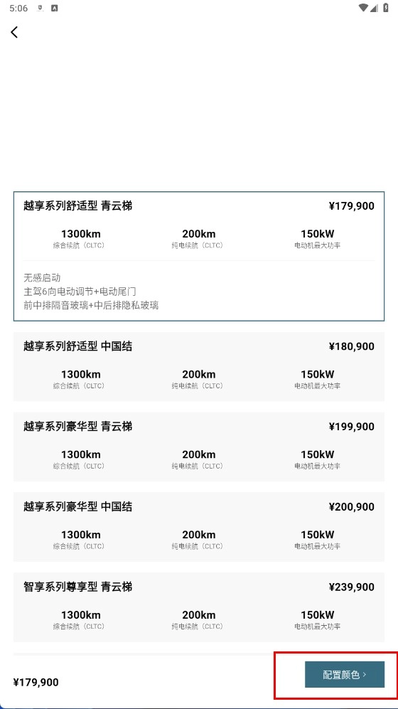 2、在车型选择页面,选择心仪车型后,点击【配置颜色-功能按钮】,进入颜色选择页面。