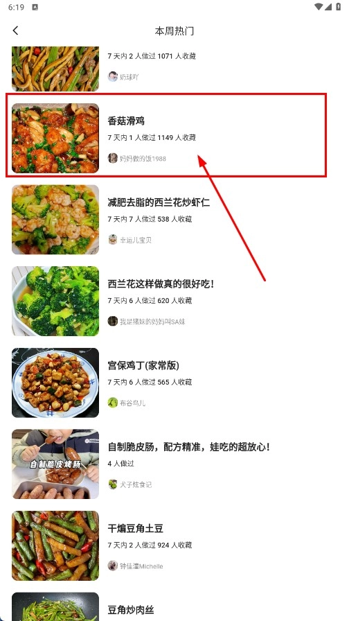 3、在本周热门列表选择【香菇滑鸡-菜谱名称】,进入菜谱详情页。